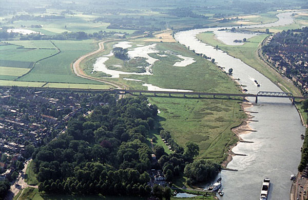 Bij de excursie naar de Gorsselse Heide noemden we indertijd al het diepe glaciale bekken van de IJsselvallei, dat ongeveer 15000 jaar geleden is gevormd. De IJssel zelf is echter een veel jongere rivier, zeker in zijn huidige vorm waarin de Rijn een belangrijk deel van het water levert. Ten tijde van de Romeinen was hij nog op meerdere plaatsen doorwaadbaar, maar dat is inmiddels heel anders. ’s Zomers stroomt hij weliswaar rustig tussen de kribben richting Ketelmeer, maar ’s winters kunnen er flinke watermassa’s passeren en is er veel bergingscapaciteit nodig om droge voeten te houden. Deze wordt gevonden in het winterbed, waarbij de daarin aanwezige uiterwaarden of weerden dan onderlopen. Via Ruimte voor de Rivier worden momenteel de bergingsmogelijkheden aanzienlijk vergroot.
